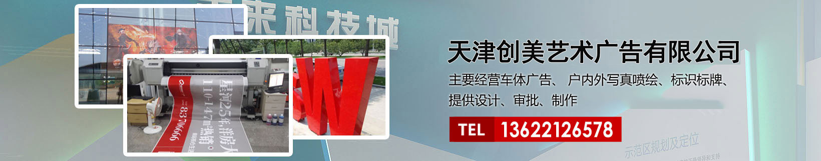 天津創(chuàng)美藝術廣告有限公司主要經(jīng)營車體廣告、 戶內(nèi)外寫真噴繪、標識標牌、提供設計、審批、制作、發(fā)布的服務。